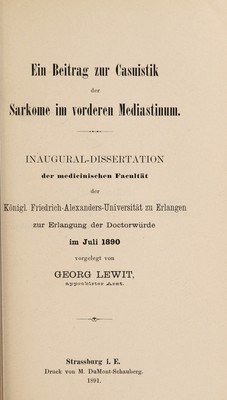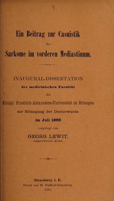 Ein Beitrag zur Casuistik der Sarkome im vorederen Mediastinum ... / vorgelegt von Georg Lewit.