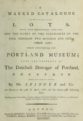 Credit: A catalogue of the Portland Museum, lately the property of the Dutchess Dowager of Portland, deceased: which will be sold by auction, by Mr. Skinner and Co. on Monday the 24th of April, 1786 ... at her late dwelling-house, in Privy-garden, Whitehall / [by the Rev. J. Lightfoot]. Source: Wellcome Collection.