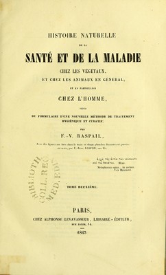 Histoire naturelle de la santé et de la maladie chez les végétaux et chez les animaux en général, et en particulier chez l'homme; suivie du formulaire pour une nouvelle méthode de traitement hygiénique et curatif / par F.-V. Raspail.