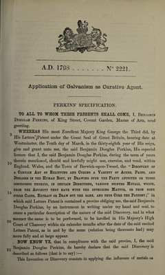 Credit: Specification of Benjamin Douglas Perkins : application of galvanism as curative agent. Source: Wellcome Collection.