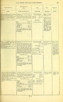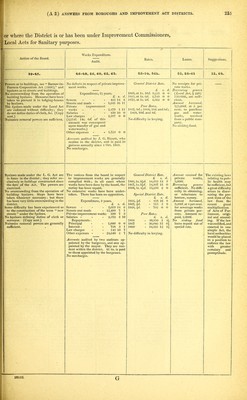 ![Action of the Board. 39-45. Powers as to buildings under the Acts and under certain byelaws which have been published and confirmed are enforced and exercised. No overcrowding from the operation of byelaws. The board's Inspector of iVuisances inspects the common lodging-houses, and sublet houses (or houses let in lodgings and occupied by more than one family), which has doubtless had a good effect. Bijdaws have been made under the Act. Great difficulty in enforcing some. They do not define duties of cleric. Recent legal decisions have shown that many byelaws suggested by the Local Government Act Office cannot be sup- ported, e.g. that as to persons com- mencing to build before the approval of the plans. Local Boards cannot make byelaws re- lating to the closing of or otherwise dealing with houses unfit for human habitation, if built before the constitu- tion of the district, although these are the houses which really require to be looked after, and in many cases closed. Power is also required to prevent rooms over privies, &c. from being occupied as sleeping apartments. There is considerable difficulty in giving hyelaws in evidence ; it should be suf- ficient to produce a printed copy signed l)y the clerk to the board. Local boards should have further powers for dealing with offensive ditches, ponds, pools, &c.; they should be enabled to fill up such places when existing by the sides of roads, and throw the surface of land so gained into the road. Works Expenditure. Audit. 46-48, 56, 60, 62, 63. Rates. 52-54, 56k. As the law now stands, the practical remedy of the board for the recovery of the expenses of private improve- ment works is against the owners of the premises at the time the work is completed. These are generally builders, having their property mort- gaged to the full value, and pur- chasers from them subsequently to the completion of the works are not liable to the board, neitlier is the property liable. On the construction of § 69 P. H. A. and § 62 L. G. A., the Home Office states (1) that the remedy against the premises applies only to cases whore the premises continue in the hands of the person liable at the time of the completion of the work; and (2) that the Local Board, after having taken proceedings success- fully before the magistrates for sum- mary recovery of expenses under § 69, cannot, in the case of mortgaged pro- perty (where the mortgagors are insol- vent and the mortgagees afterwards take possession), make an order de- claring such expenses payable by in- stalments, and proceed for their recovery against the owner or occu- pier for the time being. The sanitary condition of the population has increased through the drainage works carried out by the board, and works of drainage and other sanitary improvements whicli tlie board have caused the owners of property to carry out. Tliere has been successful local oppo- sition (1) to the construction of an outfall sewer, on the ground that the board should utilize their sewage on land instead of discharging it into the sea; and (2) to widening and improve- ment of a road. Expenditure, 3 years. £ s. d. Sewers - - - - 33,191 9 10 Streets - - - - 11,538 13 0 Private improvement works 2,570 17 6 General District Rate. (Only rate levied.) £ s. 1866, at Is. 2d 6,163 1 1867, at Is. 11(7. 10,507 18 1868, atls. 9ii. 10,483 4 The local board follow the assessment made by the Poor Law guardians, and have experienced delay in obtaining the use of the assessment and rate book from the guardians. Salaries Repayments: Principal Interest Law charges* - Other expenses 3,192 16 11 1,892 7 5,038 13 3,098 3 15,658 14 * This includes the successful opposition to the application by the Liverpool Corporation for an Act to enable them to do away with all slaughter houses, &c., [in Liverpool, and construct and maintainamonster public abattoir, &c. within the district of the Local Board. Accounts audited by Poor Law auditor. He resides upwards of 30 miles off, and is paid lil. 14s. per annum, and 1/. Is. for every day after two days. The only surcharge (in 1867 the sum of 63?. the ' amount paid as salary to the solicitor to the board) was remitted on appeal. Loans. 55, 58-61. Amount received for private works, 2,988/. 4s. id. No difficulty in ob- taining, or reluc- tance to borrow, money. Amomit borrowed, 45,585/. from in- surance companies at 5 per cent. Amount repaid, 2,256/. 15s. Sd. No sinking fund. Suggestions. 51, 64. The expenses in- curred by the Board in re- spect of private improvement works should be a first charge upon the pro- perty, and sub- sequent purcha- sers, mortgagees, and assignees should be liable for the same, as also should the tenant, to the amount of the rent due from him, lie beinj empowered to deduct any moneys paid by him from his rent. The Board should also be entitled to ob- tain payment of the estimated cost of the works before commen- cing them. If the Board ac- cept any instal- ment from defaulter against whom an order by the justices has been ob- tained, the juris- diction of the justices is there- by ousted, and the order cannot afterwards be enforced. The proceedings for the recovery of expenses due to the Board for private improve- ments have to be taken before justices of the peace. The Board should have the same right as is pos- sessed by other corporations of proceeding in any court of competentjuris- diction. CCf. Memorial.] Powers as to streets and buildings as under the Acts ; refer to buildings constructed after a certain date. They are exer- cised. No overcrowding from the operation of byelaws ; measures have been taken to prevent this. Byelaws do not regulate duties of clerk or surveyor. No difficulty in enforcing them. Nuisance removal powers are quite sufficient. As to private improvement works, there is a difficulty in finding the right owner in case of change of property. Tlie sanitary condition of the population has improved. There has been much local opposition to the execution of works