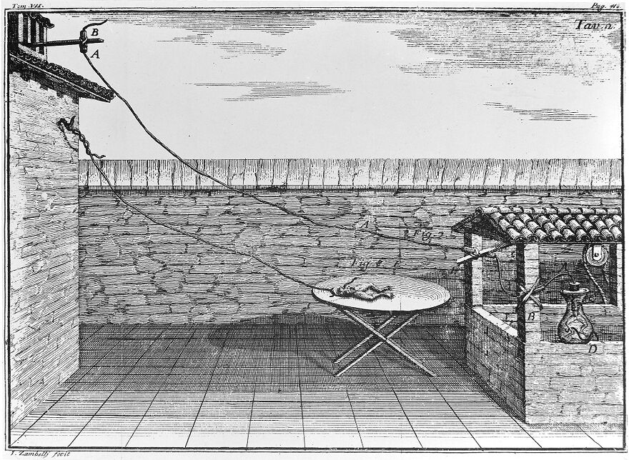 Credit: M0014521: Experiments by Galvani: the effect of atmospheric electricity on a frog, muscle-nerve preparation. Source: Wellcome Collection.
