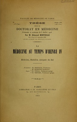 La médecine au temps d'Henri IV : médecins, maladies, autopsie du roi / Edmond Minvielle.