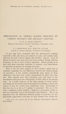 Immunisation of animals against infection by Vibrion septique ann Bacillus chauvœi / by H.R. Allen and T.J. Bosworth.