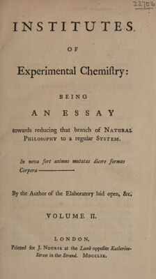 Institutes of experimental chemistry : being an essay towards reducing that branch of natural philosophy to a regular system ... / By the author of the Elaboratory laid open [i.e. Robert Dossie].