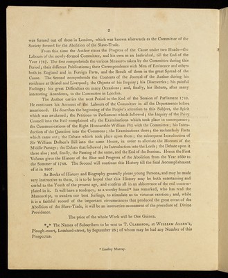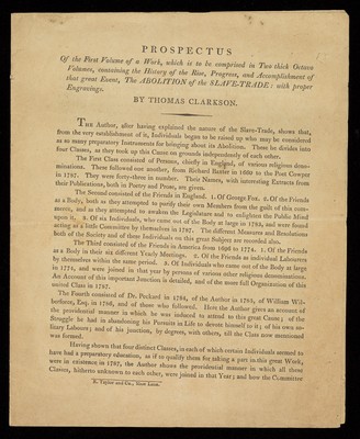 Printed Prospectus of the first volume on the History of the Rise, Progress, and Accomplishment of the Abolition of the Slave Trade, by Thomas Clarkson