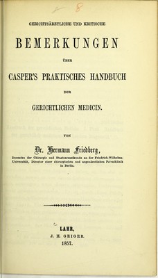 Gerichtsärztliche und kritische Bemerkungen über Casper's Praktisches Handbuch der gerichtlichen Medicin / von Hermann Friedberg.