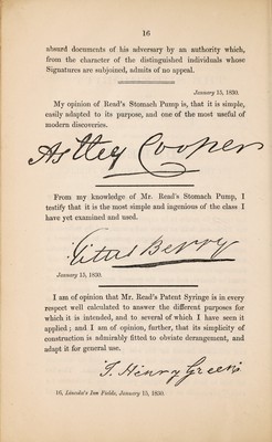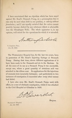 A brief account of the origin and progress of the patent syringe, or stomach pump, and lavement apparatus [invented by John Read] / [Richard Read].