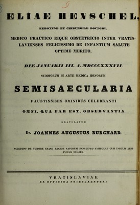Eliae Henschel, medicinae et chirurgiae doctori ... die Januarii III. a MDCCCXXXVII summorum in arte medica honorum semisaecularia faustissimis ominibus celebranti omni, qua par est, observantia / gratulatur Joannes Augustus Burchard. Accedunt de tumore cranii recens natorum sanguineo symbolae.