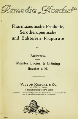 Credit: Remedia "Hoechst" : pharmazeutische Produkte, Serotherapeutische und Bakterin-Präparate / der Farbwerke vorm. Meister Lucius & Brüning Hoechst a. M. Source: Wellcome Collection.