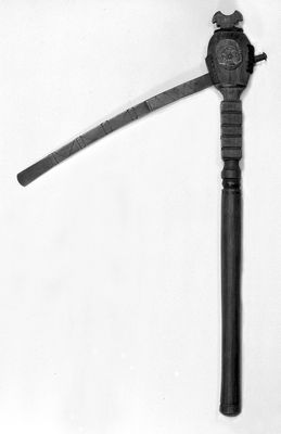 Credit: M0018243: Carved wooden rattle and a ceremonial axe. Source: Wellcome Collection.