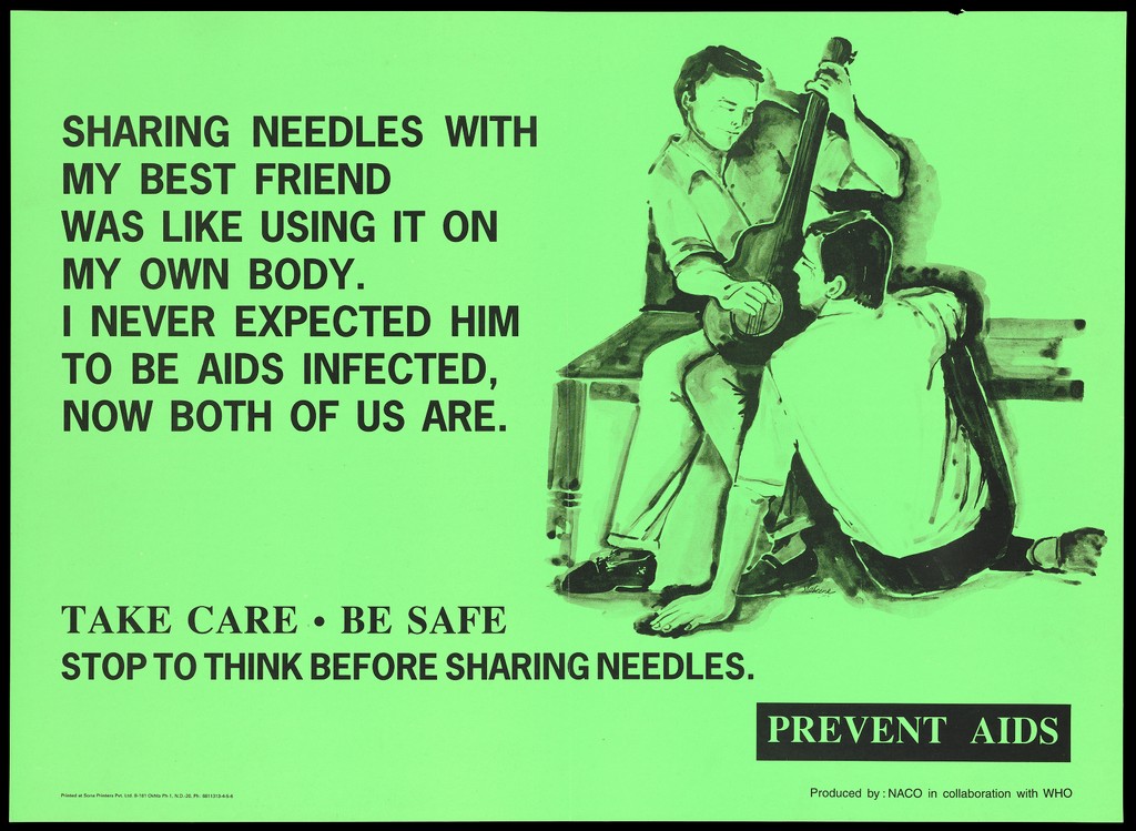 Credit: A man playing the guitar to his companion at his feet explaining how sharing needles meant they both contracted AIDS; an AIDS prevention advertisement by the NACO in collaboration with WHO. Colour lithograph, ca. 1997. Source: Wellcome Collection.
