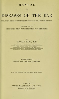 Manual of diseases of the ear : including those of the nose and throat in relation to the ear, for the use of students and practitioners of medicine / by Thomas Barr, M.D.
