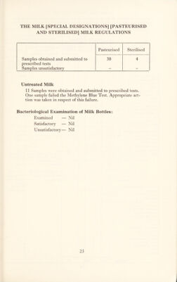 ![THE MILK [SPECIAL DESIGNATIONS] [PASTEURISED AND STERILISED] MILK REGULATIONS Pasteurised Sterilised Samples obtained and submitted to 30 4 prescribed tests Samples unsatisfactory — — Untreated Milk 11 Samples were obtained and submitted to prescribed tests. One sample failed the Methylene Blue Test. Appropriate act- tion was taken in respect of this failure. Bacteriological Examination of Milk Bottles: Examined — Nil Satisfactory — Nil Unsatisfactory— Nil](https://iiif.wellcomecollection.org/image/b29184678_0025.jp2/full/800%2C/0/default.jpg)