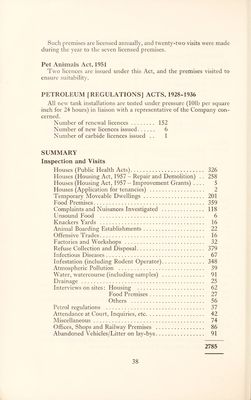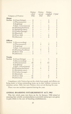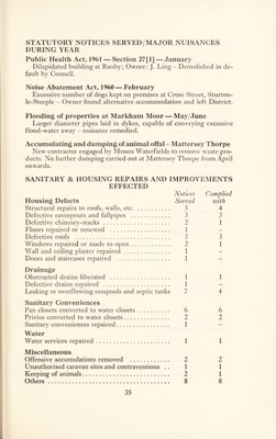 ![STATUTORY NOTICES SERVED/MAJOR NUISANCES DURING YEAR Public Health Act, 1961 — Section 27 [1] — January Dilapidated building at Ranby; Owner: J. Ling - Demolished in de- fault by Council. Noise Abatement Act, 1960 — February Excessive number of dogs kept on premises at Cross Street, Sturton- le-Steeple - Owner found alternative accommodation and left District. Flooding of properties at Markham Moor — May/June Larger diameter pipes laid in dykes, capable of conveying excessive flood-water away - nuisance remedied. Accumulating and dumping of animal offal - Mattersey Thorpe New contractor engaged by Messrs Waterfields to remove waste pro- ducts. No further dumping carried out at Mattersey Thorpe from April onwards. SANITARY & HOUSING REPAIRS AND IMPROVEMENTS EFFECTED Notices Complied Housing Defects Served with Structural repairs to roofs, walls, etc 5 4 Defective eavespouts and fallpipes 3 3 Defective chimney-stacks 2 1 Floors repaired or renewed 1 - Defective roofs 3 3 Windows repaired or made to open 2 1 Wall and ceiling plaster repaired 1 - Doors and staircases repaired 1 - Drainage Obstructed drains liberated 1 1 Defective drains repaired 1 - Leaking or overflowing cesspools and septic tanks 7 4 Sanitary Conveniences Pan closets converted to water closets 6 6 Privies converted to water closets 2 2 Sanitary conveniences repaired 1 - Water Water services repaired 1 1 Miscellaneous Offensive accumulations removed 2 2 Unauthorised caravan sites and contraventions .. 1 1 Keeping of animals 2 1 Others 8 8](https://iiif.wellcomecollection.org/image/b29184678_0037.jp2/full/800%2C/0/default.jpg)