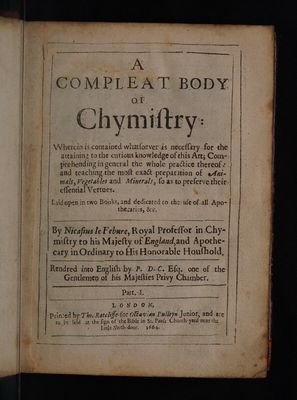 Credit: A compleat body of chymistry: wherin is contained whatsoever is necessary for ... knowledge of this art ... and teaching the most exact preparation of animals, vegetables and minerals, so as to preserve their essential vertues / Rendered into English by P. D[e] C[ardonnel] Esq. one of the gentlemen of His Majesties Privy Chamber. Part. I.[-The second part]. Source: Wellcome Collection.