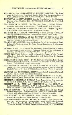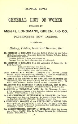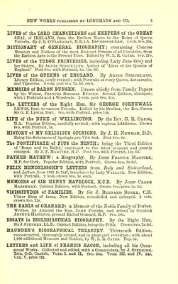 ![LIVES of the LOUD CHANCELLORS and KEEPERS of tlie GREAT SEAL of IRELAND, from the Earliest Times to the Reign of Queen Victoria. By J. R. O'Flanagan, M.R.I.A. Barrister-at-Law. 2 vols. 8vo. 36s. DICTIONARY of GENERAL BIOGRAPHY; containing Concise Memoirs and Notices of the most Eminent Persons of all Countries, from the Earliest Ages to the Present Time. Edited by W. L. R. Gates. 8vo. 21s. LIVES of the TTJDOR PRINCESSES, including Lady Jane Grey and her Sisters. By Ag>ES Stkickland, Author of 'Lives of the Queens of England.' Post 8vo. with Portrait, &c. 125. 6d. LIVES of the QUEENS of ENGLAND. By Agnes Strickland. Library Edition, newly revised; with Portraits of every Queen, Autographs, and Vignettes. 8 vols, post 8vo. 75. Gd. each. MEMOIRS of BARON BTJNSEN. Drawn chiefly from Family Papers by his Widow, Frances Baroness Bunsen. Second Edition, abridged; with 2 Portraits and 4 Woodcuts. 2 vols, post 8vo. 2l5. The LETTERS of the Right Hon. Sir GEORGE CORNEWALL LEWIS, Bart, to various Priends. Edited by his Brother, the Rev. Canon Sir G. F. Lewis, Bart. 8vo. with Portrait, price 145. LIFE of the DUKE of WELLINGTON. By the Rev. G. R. Gleig, M.A. Popular Edition,'carefully revised; with copious Additions. Crown 8vo. with Portrait, 55. HISTORY of MY RELIGIOUS OPINIONS. By J. H. Newman, D.D. Being the Substance of Apologia pro Vita Su^. Post 8vo. 65. The PONTIFICATE] of PIUS the NINTH; being the Third Edition of'Rome and its Ruler,' continued to the latest moment and greatly enlarged. By J. F. Maguire, M.P. Post Svo. with Portrait, 125. 6d. FATHER MATHEW: a Biography. By John Francis Maguire, M.P. for Cork. Popular Edition, with Portrait. Crown 8vo. 35. Gd. FELIX MENDELSSOHN'S LETTERS from Ital^ and Switzerland, and Letters from 1833 to 1847, translated by Lady Wallace. New Edition, with Portrait. 2 vols, crown Svo. 55. each. MEMOIRS of SIR HENRY HAVELOCK, K.C.B. By John Clark Maeshman. Cabinet Edition, with Portrait. Crown Svo. price 35. Gd. VICISSITUDES of FAMILIES. By Sir J. Bernard Burke, C.B. Ulster Kuig of Arms. New Edition, remodelled and enlarged. 2 vols, crown Svo. 2l5. THE EARLS of GRANARD: a Memoir of the Noble Family of Forbes. Written by Admiral the Hon. John Fokbes, and edited by Geoegb Arthur Hastings, present Earl of Granard, K.P. Svo. 105. ESSAYS in ECCLESIASTICAL BIOGRAPHY. By the Right Hon. Sir J. Stephen, LL.D. Cabinet Edition, being the Fifth. Crown Svo. 75. Gd. MAUNDER'S BIOGRAPHICAL TREASURY. Thirteenth Edition, reconstructed, thoroughly revised, and in great part rewritten ; with about 1,000 additional Memoirs and Notices, by W. L. R. Cates. Fcp. Gs. LETTERS and LIFE of FRANCIS BACON, including all his Occa- sional Works. Collected and edited, with a Commentary, ny J. Spedding, Trin. Coll. Cantab. Vols. I. and II, Svo. 245. Vols. III. and IV. 24«.](https://iiif.wellcomecollection.org/image/b21975802_0349.jp2/full/800%2C/0/default.jpg)