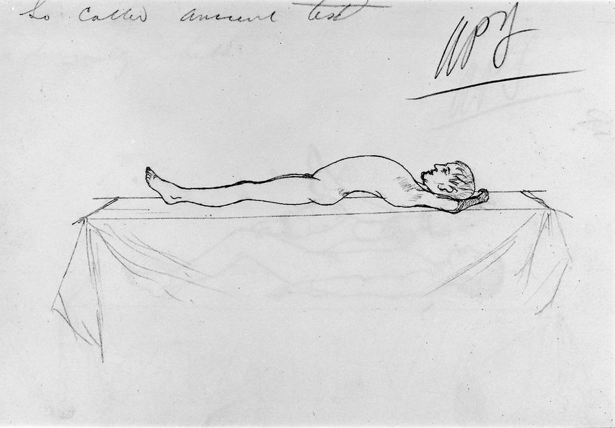 Credit: M0019193: Illustration showing the compensatory curve in the spine when a limb is extended in cases of hip disease. Source: Wellcome Collection.