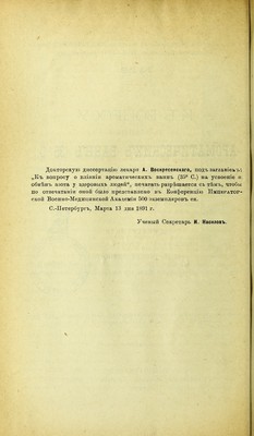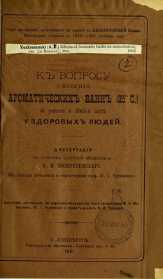 K voprosu o vliianii aromaticheskikh vann (35° C.) na usvoenie i obmien azota u zdorovykh liudei : dissertatsiia na stepen' doktora meditsiny / A.I. Voskresenskago ; tsenzorami dissertatsii, po porucheniiu Konferentsii, byli professory V.A. Manassein, Iu.T. Chudnovskii i privat-dotsent F.K. Geisler.