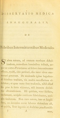 Credit: Dissertatio medica, inauguralis, de febribus intemittentibus [sic] medendo : Quam, ... pro gradu doctoris, ... / eruditorum examini subjicit Franciscus Buchanan. Source: Wellcome Collection.