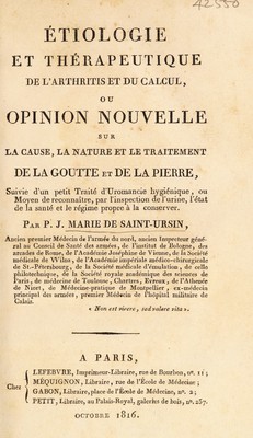 Étiologie et thérapeutique de l'arthritis et du calcul, ou opinion nouvelle sur la cause ... et le traitement de la goutte et de la pierre, suivie d'un petit traité d'uromancie hygienique / [P.J. Marie de Saint-Ursin].