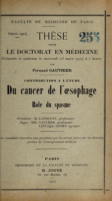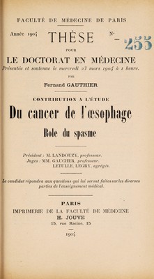 Contribution à l'étude du cancer de l'œsophage : role du spasme ... / par Fernand Gauthier.