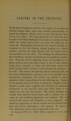 Remarks on hernia ; A case of congenital macrostoma and deformity of the ear ; Case of excision of the upper jaws ; Unusual specimen of gangrenous bowel ; Sarcoma of the testicle / by Rushton Parker.