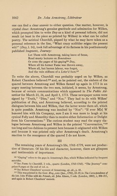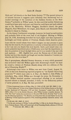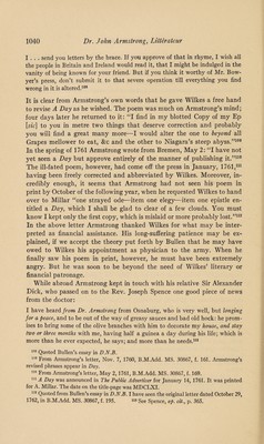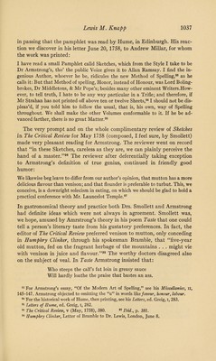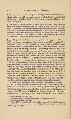 ![DR. JOHN ARMSTRONG, LITTERATEUR, AND ASSOCIATE OF SMOLLETT, THOMSON, WILKES, AND OTHER CELEBRITIES • i7W TWO hundred years ago, in April, 1744, there was printed in London a long didactic poem in blank verse, The Art of Preserving Health, which brought its author, Dr. John Armstrong, considerable literary reputation during the following century in England, Italy, and America.1 In this work there are occasional passages of very pleasing poetry, but the goddess Hygeia, whom Armstrong invoked with all due fervor, failed to inspire him to create an enduring masterpiece on such themes as air, diet, and exercise. Consequently, during the last century there has been little interest in his poems and essays, or in his life, personality, and friendships. There is, of course, A. H. Bullen’s short article in the Dic¬ tionary of National Biography, which added little, however, to Robert Anderson’s memoir,2 or to Robert Chambers’ account,3 and more recently V _ _ Mr. Iolo A. Williams paid tribute to The Art of Preserving Health and published a bibliography of Armstrong’s works.4 But there is no likeli¬ hood that Armstrong’s writings will be much read or discussed in the future except by literary antiquarians and special students of the eight¬ eenth century. Why, then, should anyone write about Armstrong today? There are several valid reasons. The first is that all written accounts of his life are woefully incomplete. Secondly, no one has attempted to give a complete evaluation of his personality. And finally, Armstrong’s associations with eighteenth-century celebrities, such as Thomson, Wilkes, the painter Fuseli, and especially Smollett, are of lively interest to explorers of that age of worthy “originals.” My purpose, therefore, is to present a rather complete account of Armstrong in order to restore the faded colors of his portrait, and to reveal him and his associates more clearly. I According to Robert Chambers, Armstrong’s family5 had been promi¬ nent among the old rievers of the Scottish border. Armstrong himself was 1 The Art of Preserving Health was many times reprinted in England. In 1745 Benjamin Franklin printed it in Philadelphia. It was issued in Boston in 1757 and subsequently; it was translated into Italian by Thomas J. Mathias and published at Naples in 1825. Hazlitt included the whole poem in his Select British Poets (London, 1824). 2 The Works of the British Poets, ed. Robert Anderson, M.D., x (London, 1795), [963]—966. 3 Robert Chambers, A Biographical Dictionary of Eminent Scotsmen (Glasgow, 1835), i, 58-64. 4 See Iolo A. Williams, By-Ways Round Helicon (London, 1922), pp. 8-14; and his Seven XVIIIth Century Bibliographies (London, 1924), pp. 17-38. 6 Op. cit., p. 58](https://iiif.wellcomecollection.org/image/b30632018_0001.jp2/full/800%2C/0/default.jpg)