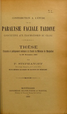 Contribution à l'étude de la paralysie faciale tardive consécutive aux traumatismes du crâne : thèse présentée et publiquement soutenue à la Faculté de médecine de Montpellier le 28 novembre 1900 / par P. Stephanoff.