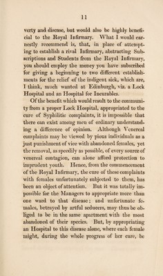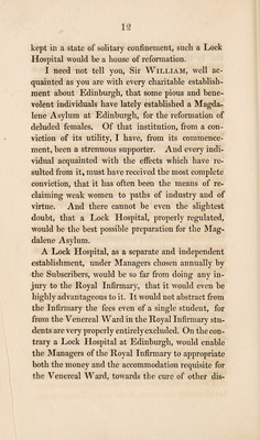 Credit: A letter to Sir William Fettes, Bart. : affording demonstrative evidence, that much greater benefit will arise to those who have at once to struggle both with poverty and disease, from improving the Royal Infirmary by the establishment of a lock hospital, and an hospital for incurables, than by beginning a new rival infirmary, which may be productive of many evils / By Andrew Duncan, Sen. Source: Wellcome Collection.