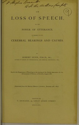 On loss of speech, or the power of utterance, in respect to its cerebral bearings and causes / by Robert Dunn.