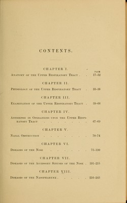 ![CHAPTER I. PAGE Anatomy of the Titer Respiratory Tract . . 17-32 CH AFTER II. Physiology of the Upper Respiratory Tract . 33-38 CHAPTER II J. Examination of hie Upper Respiratory'Tract . 39-66 CHAPTER IV. Antisepsis in Operations upon the Upper Respi- ratory Tract 67-69 CHAPTER V. Nasal Obstruction 70-74 CHAPTER VI. Diseases of the Nose 75-190 CHAPTEB VII. Diseases o] phi Accessory Sinuses of the Nos] 191-215 MIA pt E i; V I I I. Diseases of mm Nasopharynx 216 243](https://iiif.wellcomecollection.org/image/b21029593_0015.jp2/full/800%2C/0/default.jpg)