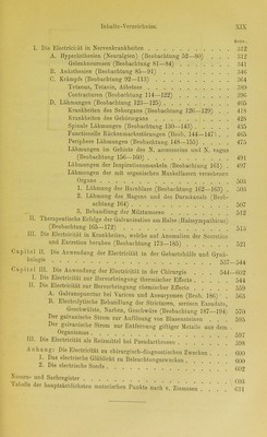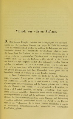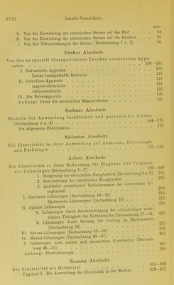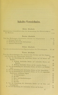 ![Iiilialts -Verzeicliiiiss. Erster Abschnitt. Ifistorisclier Ueberblick über die Anwendirng der Electrjcität in d e r M e d i c i n Seite. 1—8 Zweiter Abschnitt. Von den Wirkungen electrischer Ströme iin Allgemeinen . . . 9—3G 1. Reibungs-Electrieitiit 9 2. Berübrungs-Electricitcät (Galvanismus) ] 1 3. Inductions-Electricität 32 Dritter Absclinitt. Von den electromotorisclien Eigenschaften des Tli ierkörpers . 37 4G Vierter Abschnitt. Von den Einwirkungen der electriscben Ströme auf die Organe und Gewebe des thierischen Körpers 47. A. Von der Einwirkung der electriscben Ströme auf die Nerven und Muskeln 1. Wirkung electrischer Ströme auf motorische Nerven und Muskeln 2. Wirkung eleclrischor Ströme auf die sensiblen Nerven B. Von der Einwirkung der electriscben Slrömo auf Gehirn und Rücken mark C. B. \on der Einwirkung der electriscben Ströme auf den Sympathicus Von der Einwirkung der electriscben Ströme auf die mit organiscbei Muskelfasern versehenen Organe 1. Verdauungsorgane 2. Die Milz 3. Harn- und Geschlechtsorgane . 4. Die Iris b. Das Herz E. Von der Einwirkung ,der electriscben Lyniphgefiisse F. Von der Einwirkung der electriscben Ströme auf die Haut Ströme auf die Blut- um -102 47 47 G9 7b 80 Sb 8G 87 88 89 89 91 92](https://iiif.wellcomecollection.org/image/b28093549_0021.jp2/full/800%2C/0/default.jpg)