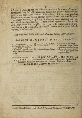 Quaestio medica ... An conficiendae bili a mesenterio oleum, a faecibus liquor alkalinus? / [Jean Nicolas Millin de La Courvault].