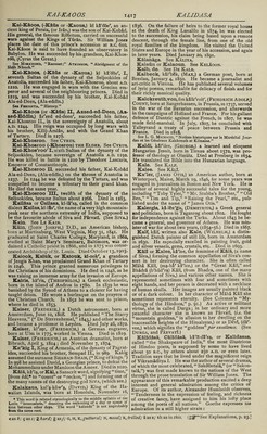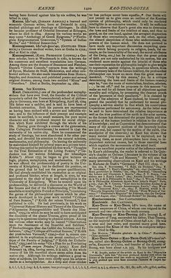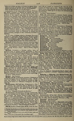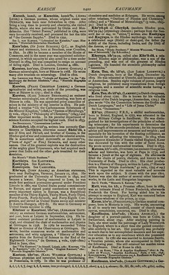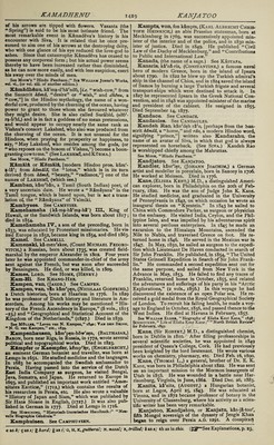 ![Karsch, kaRsh, or Karschin, kaRsh'In, (Anna Luise,) a German poetess, whose original name was Durbach, was born near Schwiebus in 1722. After living a long time in poverty and obscurity, she visited Berlin, where she was patronized by Gleim and Men¬ delssohn. Her “Select Poems,” published in 1764, were very favourably received, and procured for her the title of “the German Sappho.” Died in 1791. See L. von Kleuke, “ Lebenslauf der Karschin,” 179a; Hir- sching, “ Historisch-literarisches Handbuch.” Kars'lake, (Sir John Burgess,) Q.C., an English lawyer and statesman, born at Bencham, nea’r Croydon, in 1821. In 1867 he became a member of the House of Commons, and in the same year was appointed solicitor- general, in which capacity he also acted for a time under Disraeli in 1874, but was compelled to resign on account of failing sight. Died in London, October 4, 1881. Karsten, kaR'sten, (Dietrich Ludwig Gustav,) a German mineralogist, born at Biitzow in 1768. He wrote many able treatises on mineralogy. Died in 1810. See Leopold von Buch, “Lobrede auf Karsten,” in the “Ab- handlungen der Berliner Akademie,” 1814; “Nouvelle Biographic CWn^rale.” Karsten, (Franz Christian Lorenz,) a German agriculturist and writer, an uncle of the preceding, was born at Biitzow in 1751 ; died in 1829. Karsten, (Karl Johann Bernhard,) an eminent Prussian mineralogist, son of the preceding, was born at Biitzow in 1782. He was appointed privy councillor of mines in the ministry of the interior in 1819. He pub¬ lished a treatise “ On the Carbonaceous Substances of the Mineral Kingdom,” (1826,) a “ System of Metallurgy,” (5 vols., 1832,) a “Philosophy of Chemistry,” (1843,) and other important works. In his peculiar department of science Karsten occupied the highest rank. Died in 1853. See Brockhaus, “ Conversations-Lexikon.” Kctrtik&ya, ktR-tl-ka'ya, written less correctly Car- ticeya or Cartikiya, otherwise named Skan'da, a son of Siva and Parvati, and brother of Ganesa, is the Hindoo god of war and commander of the celestial armies. He is sometimes called AgnibhOs or Agnibhu'va, (“born of Agni” or Fire,) Srimana, and many other names. One of his greatest exploits was the destruction of the mighty giant Tripurasura, who had acquired 9uch power that Indra and the other gods trembled for their dominion. See Moor’s “ Hindu Pantheon.” Kartikiya. See Kartikeya. Kashyapa. See Kasyapa. Kassiopeia. See Cassiopeia. Kas'spn, (John Adams,) an American statesman, born near Burlington, Vermont, January 11, 1822. He raduated at the University of Vermont in 1842, and ecame a lawyer. Having removed to Iowa, he was made first assistant postmaster-general under President Lincoln in 1861, was United States postal commissioner to Europe, and signed postal conventions with nearly every important nation in Europe, was a Republican member of the Thirty-Eighth, Thirty-Ninth, Forty-Third, Forty-Fourth, Forty-Seventh, and Forty-Eighth Con¬ gresses, and served as United States envoy and minister to Austria-Hungary, 1877-81. He went to Germany as United States minister in 1884. Kastner or Kaestner, k&st'n^r, (Abraham Gott- HELF,) an eminent German mathematician, astronomer, and poet, born at Leipsic in September, 1719. He be¬ came assistant professor of mathematics at Leipsic in 1746, and obtained the chair of mathematics and physics at Gottingen in 1756. In 1762 he succeeded Tobias Mayer as director of the Observatory at Gottingen. He wrote, besides numerous works on mathematics and astronomy, and witty epigrams, a “ History of Mathe¬ matics from the Revival of Science to the End of the Eighteenth Century,” (in German, 4 vols., 1796-1800.) Died in June, 1800. See “Vita Kaestneri,” by himself, Leipsic, 1787; Kirsten, “De A. G. Kaestnero,” 1787; C. G. Hbyne, “ Elogium Kaestneri,” 1801; “Nouvelle Biograpnie G^n^rale.” chemistry and medicine at Erlangen. He wrote, among other treatises, “Outlines of Physics and Chemistry,” (1821,) and a “Manual of Meteorology,” (3 vols., 1823- 30.) Died in 1857. KSs'yS-p5 or CasyapS, (modern Hindoo pron. kus'ya-pa,) [etymology obscure; perhaps from the San¬ scrit kas or kaf, to “shine,”] written also Kashyapa and Kapyapa, in the Hindoo mythology, the name of a celebrated sage (Rishi) or demi-god, the father (by Aditi) of the Suras, including Indra, and (by Diti) of the Asuras, or giants. See Moor, “Hindu Pantheon;” Monibr Williams, “Transla¬ tion of SakoontalS,” (by KalidAsa.) Kflsyapa, kis'ya-pa, called also Kan'3-d&, a cele¬ brated Hindoo sage or philosopher, was a son of the preceding, and was one of the greatest of Hindoo logicians. He founded the atomistic philosophy called “ vaiseshika.” Kate, Ten, tfin kl't^h, (Jan Jakob Lodewyk,) a Dutch clergyman, born at the Hague, December 23, 1819. He was educated at Utrecht, and became a pastor at Amsterdam. Besides eight volumes of poems, largely religious, he published many translations from foreign languages, and a number of scientific works having a religious tone. Kate, Ten, tSn kl'teh, (Lambert,) a Dutch clergyman, who lived about 1720. He is known for his valuable grammar of the Dutch language, (Amsterdam, 1723.) He also wrote “ On the Connection between the Gothic and Dutch Languages,” and a “Life of Jesus Christ” See Sax, “ Onomasticon.” Ka'ter, (Henry,) F.R.S., a skilful mathematician, born in Bristol, England, in 1777, was educated in the Royal Military College in Sandhurst. He was distin¬ guished for his investigations of the principles of reflect¬ ing telescopes; for his experiments to determine the exact length of the seconds-pendulum ; for his important advice and improvements on measures and weights ; and especially for his invention of the floating collimator, an instrument for adjusting the telescope. In 1814, when the emperor Alexander of Russia visited England, Kater was decorated by him with the order of Saint Anne. He wr