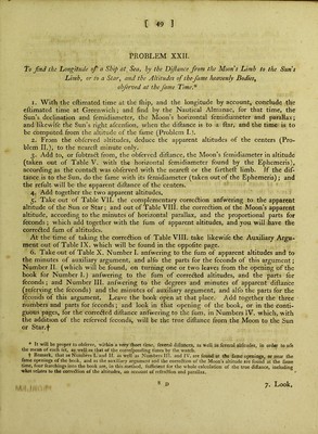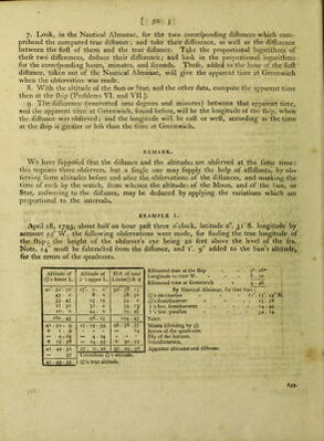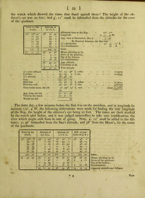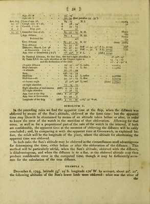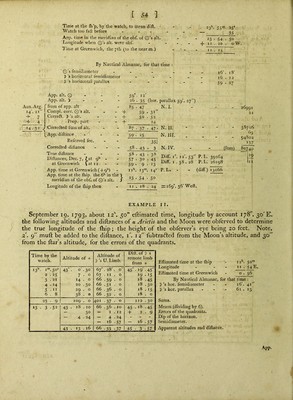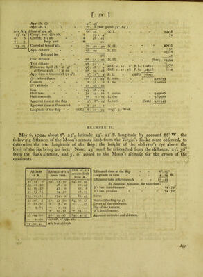 ![Time at the (h*p, by the watch, to mean dift. Watch too fa ft before - - - App. time in the meridian of the obf. of O’s alt. Longitude when O’s alt. were obf. I'ime at Greenwich, the yth (to the near m.) 23!*, 55™. 2S‘ 35 23 • 54 . 50 11 . 20 . 0 11 . ■ 15 By Nautical Almanac, for that time : Q's femidiameter - - J) ’s horizontal femidiameter - . _ i) ’s horizontal parallax . . _ i6'. 18' l6 . 12 59 • 27 Aux.Arg. 14.2t + 7 _+ 4 14.32 App. alt. O App. alt. >  Suna of app. alt Compl. corr. Q’s alt. Correft. 5’s alt. Prop, part Corredted fura of alt. + + + App. dlftance - - . Refcrved fee. Corredted difiance _ . _ True diftance _ - _ Difiances, Dec. 7, / at Q** - at Greenwich \at12 App. time at Greenwich (-|-9'’) App. time at the fliip, the in the) meridian of the obf. of O’s alt. J Longitude of the fliip then 59 • 12 26 ■ 35 (hor. parallax 59'. 27) 85 . 47 N. I. 47 59 50 31 52 24 87 . 37 . 47- 59 • 25 35l 58. ■ 43 . 3 58 . 43 . 38 57 . 30 . 45 59 • 9 • 13 ii\ 13™. 14= 23 . 54 • 50 ] I . , 18 . 24 N. II: N. Ill, N. IV. (fum) DifF. Diff. 12.53 38 . 28 P. L. - P. L. 39264 P. L7 26198 (diff.) 13066 2^169°. 36'Weft. 26991 21 58726 63' 94S02 137 80740 ll I EXAMPLE II. September ig, 1793, about 30” eftlmated time, longitude by account 178°. 30'E. tbe following altitudes and diftances of a Arietis and the Moon were obferved to determine the true longitude of the ftiip ; the height of the obferver’s eye being 20 feet. Note, 2. g' muft be added to the diftance, i^ 1%' fubtradted from the Moon’s altitude, and 30 from the ftar’s altitude, for the errors of the quadrants. Eflimated time at tbe (hip - 12'“. 50™ Longitude - - - 11 . 54^» Eftimated time at Greenwich - o . 5.6 By Nautical Almanac, for that tirne : I) ’s hor. femidiameter - - 16', 41 D’s hor, parallax - - 61 . 13. Sums. Means (dividing by 6). Errors of the quadrants. Dip of the horizon. Semidiameter. Apparent altitudes and diftance. Time by the watch. Altitude of * Altitude of j) 's U.Limb. Dift. of ]) s remote limb from * 13''. I” .50' 43° 0' •30 67° . 28' . o' 45 ’.19' -.45 2 25 7 . 0 67 . II • 0 19 . IS 3 . 21 14 . 0 66 •59 . 0 18 •45 4 . 14 20 •50 66 .51 . 0 18 •30 5 . 11 29 . 0 66 • 36 , 0 18 • 15 6 . 8 38 . 0 66 •32 . 0 - 18 . 0 23 • 9 109 . 0 401 • 37 . 0 112 •30 13 • 3 •52 43 18 . 10 66 •56 10 45 . 18 •45 — 30 — I 12 + 2 • 9 — 4 24 — 4 24 - - - — 16 •57 — 16 •57 43 13 16 66 ■33 •37 45 • 3 •57](https://iiif.wellcomecollection.org/image/b22007659_0672.jp2/full/800%2C/0/default.jpg)