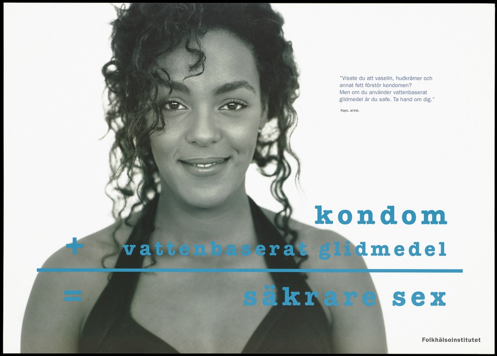 Kayo, an artist stating that only water-based lubricants are safe to use to prevent AIDS; an advertisement by Folkhälsoinstitutet. Colour lithograph, 199-.
