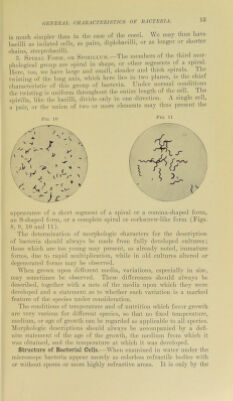 ![is mucli simpler than in the ease of the cocci. We may thus have bacilli as isolated cells, as pairs, diplohacilli, or as longer or shorter chains, strcptohacilli. 3. Spiral Form, or Spirillum.—The members of the third mor- phoiogical gronp are spiral in shape, or other segments of a spiral. Here,' too, we have large and small, slender and thick spirals, ihe twisting of the long axis, which here lies in. two planes, is the chief characteristic of this gronp of bacteria. ^ Under normal conditions the twisting is nniform thronghont the entire length of the cell, ihe spirilla, like the bacilli, divide only in one direction. A single cell, a pair, or tbe union of two or more elements may thus present the Fig. 10 Fig. 11 appearance of a short segment of a spiral or a comma-shaped form, an S-shaped form, or a complete spiral or corkscrew-like form (Figs. 8, 9, 10 and 11). The determination of morphologic characters for the description of bacteria should always be made from fully developed cultures; those which are too young may present, as already noted, immature forms, due to ra]iid multiplication, while in old cultures altered or degenerated forms may be observed. When gi’own upon different media, variations, especially in size, may sometimes be observed. Tliese differences sbould always be described, together with a note of the media upon ivhich they were develoyied and a statement as to whether such variation is a marked feature of the species under consideration. The conditions of temiierature and of nutrition which favor growth are very various for different species, so that no fixed temperature, medium, or age of growth can be regarded as a]>plicable to all species. !Mor])hologic descriptions should always be accompanied by a defi- nite statement of the age of the growth, the medinm from which it was obtained, and the tem])crature at which it was developed. Structure of Bacterial Cells.—When examined in water under the microsco])o bacteria ap]>ear merely as colorless refractile bodies with or without spores or more highly refractive areas. It is only by the](https://iiif.wellcomecollection.org/image/b28137541_0031.jp2/full/800%2C/0/default.jpg)