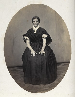 Credit: A seated woman, viewed from the front in full length; her hands are deformed. Photograph by L. Haase after H.W. Berend, c. 1865. Source: Wellcome Collection.
