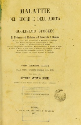 Malattie del cuore e dell'aorta / di Guglielmo Stockes ; prima traduzione italiano sulla prima edizione inglese del 1854 per cura del Dottore Antonio Longhi.