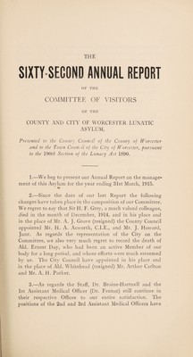 Sixty-second annual report of the County & City of Worcester Lunatic Asylum, Powick, for the 1914-15, and financial statements.