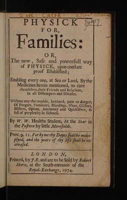 Credit: Physick for, families: or the new, safe and powerfull way of physick, upon constant proof established: enabling everyone, at sea or land, by the medicines herein mentioned, to cure themselves, their friends and relations in all distempers and diseases, Without any the trouble, hazzard, pain, or danger, of purgers, vomitters, bleedings, issues, glisters, blisters, opium, antimony and quicksilver. So full of perplexity in sickness / By W[illiam] W[alwyn] Healths Student. Source: Wellcome Collection.
