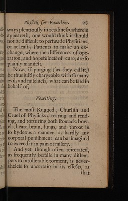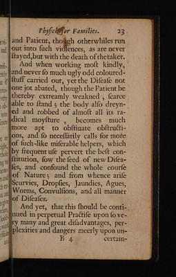 Credit: Physick for, families: or the new, safe and powerfull way of physick, upon constant proof established: enabling everyone, at sea or land, by the medicines herein mentioned, to cure themselves, their friends and relations in all distempers and diseases, Without any the trouble, hazzard, pain, or danger, of purgers, vomitters, bleedings, issues, glisters, blisters, opium, antimony and quicksilver. So full of perplexity in sickness / By W[illiam] W[alwyn] Healths Student. Source: Wellcome Collection.