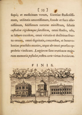 Credit: Oratio Harveiana, principibus medicis parentans; medicinam, academias utrasque laudans; empiricos, eorum cultores perstringens; Collegium usque a natalibus illustrans: in Theatro Collegii Regalis Medicorum Londinensium habita festo Divi Lucae, MDCCLI ... / [William Browne]. Source: Wellcome Collection.