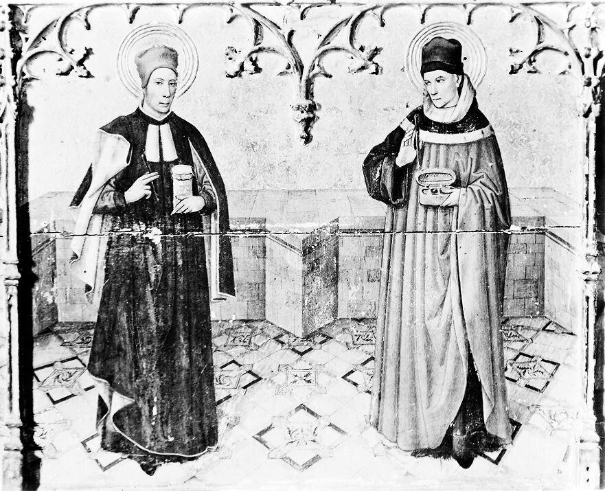 Credit: M0007689: Photograph of an altar piece painting of Saints Cosmas and Damian. Source: Wellcome Collection.