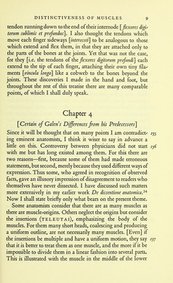![on exposed parts, recognized them explicidy and completely, telling the patients to make this movement or that, such as we knew was effected by this or that muscle, sometimes contract/ ing or displacing the muscles a litde to observe a large artery, nerve, or vein lying beside them. We then saw some students, as though blind, unable to recognize the parts, uselessly raising or displacing the exposed muscles (which needlessly distressed the patients), or even making no attempt to observe. Yet others, who had had more practice, knew how to direct the patient to move the part appropriately. Thus I perceived that, in observing wounds, those are confirmed who already know what to expect, but the ignorant learn nothing thereby. 226 I therefore maintain that the bones must be learnt either from man, or ape, or better from both, before dissecting the muscles, for these two [namely bones and muscles] form the ground-' work of the other parts, the foundations, as it were, of a build/ ing. And next, study arteries, veins, and nerves. FamiHarity with dissection of these will bring you to the inward parts and so to a knowledge of the viscera, the fat, and the glands, which also you should examine separately, in detail. Such should be the order of your training. As I have already said, you should seek in demonstrations to uncover the part for study as rapidly as possible, and to dis/ play it in many aspects, adopting various methods of handling. If you have no ape, bodies of other animals must serve, making 22 j clear from the start wherein they differ from an ape, as I shall presently explain. Chapter 3 [Distinctiveness of Muscles and Neglect of the Ancients in dissecting Them] First read my exposition De ossihus^^ so as to have it at your 227 finger/tips, not only as regards the facts, but also the names, for I cannot discuss incidental points during my argument.](https://iiif.wellcomecollection.org/image/b20457194_0037.jp2/full/800%2C/0/default.jpg)