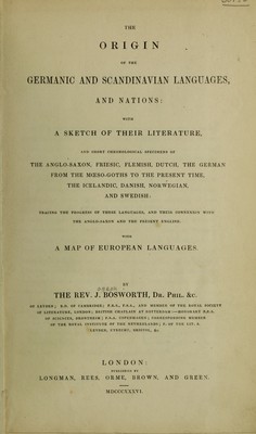 The origin of the Germanic and Scandinavian languages, and nations: with a sketch of their literature, and short chronological specimens of the Anglo-Saxon, Friesic, Flemish, Dutch, the German from the Moeso-Goths to the present time, the Icelandic, Danish, Norwegian, and Swedish tracing the progress of these languages, and their connexion with the Anglo-Saxon and the present English. With a map of European languages / by the Rev. J. Bosworth.