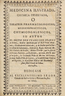 Medicina ilustrada, chymica observada, o theatros pharmacologicos, médico-practicos, chymico-galenicos / Su autor Francisco Suarez de Ribera.