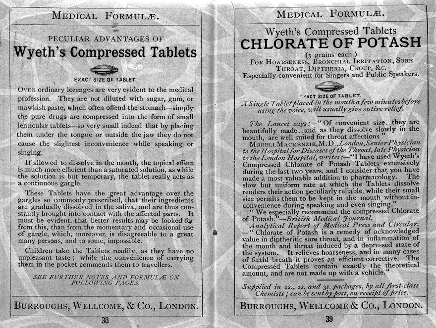 Credit: M0017760: Detail of Wyeth's compressed tablets of chlorate of potash, 1881. Source: Wellcome Collection.