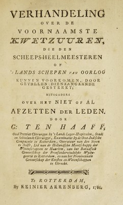 Verhandeling over de voornaamste kwetzuuren, die den scheeps-heelmeesteren op 's lands schepen van oorlog kunnen voorkomen, door gevallen dienaangaande gesterkt; mitsgaders over het niet of al afzetten der leden ... / [Gerard ten Haaff].